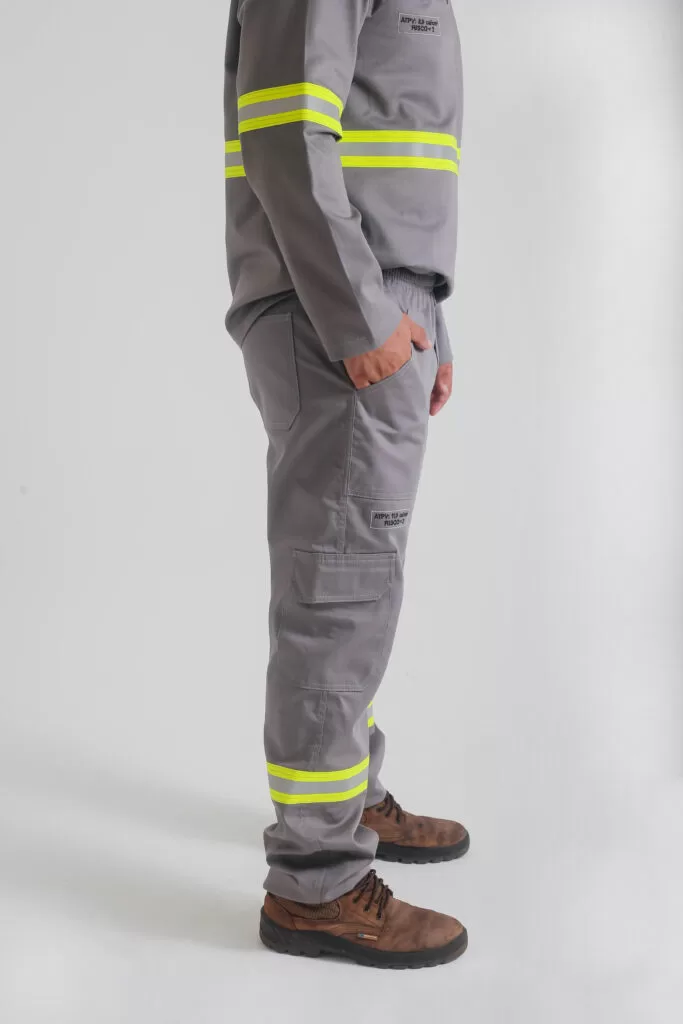 Aprovado para proteção dos membros inferiores do usuário contra agentes térmicos provenientes de arco elétrico e fogo repentino.