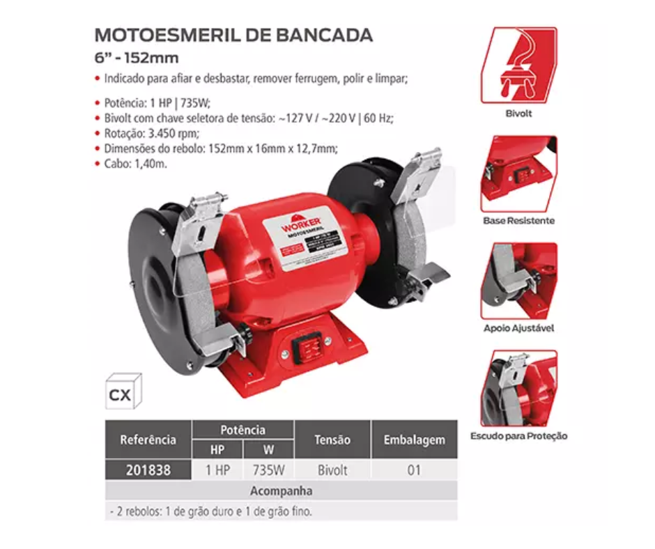 Indicado para afiar e desbastar, remover ferrugem, polir e limpar. (Potência 360W)